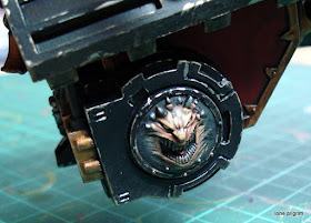You can see the weathering I did on the red armour plates in this photograph. It was a tip I picked up from the Imperial Armour Modelling Masterclass book from Forge World. I got a sponge from a blister pack and tapped it in some Boltgun Metal. I then lightly dabbed this on the plates to make it look like the red paint had been scrubbed off so the metal underneath was showing. The advantage to this technique is that the sponge leaves tiny, tiny flecks of paint in a random pattern which you could never achieve with a paintbrush.